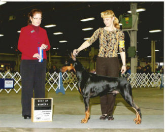 In February 1999, Dawn and Country began a Specials Career and reached the Top 20 in two and a half months. He has had an incredible career which includes 15 Best In Shows, 154 Best Of Breeds, 112 Group placements, 7 Best In Specialty Shows, and a Top 20 contender for 1999, 2000 and 2001. He won an Award of Merit the only time he was shown as a special at the DPCA National. He received a Westminster invitation in 2000. Country was ranked Number Two Doberman and Number 10 Working dog in 1999 and Number 8 Doberman and Number 18 Working dog in 2000.