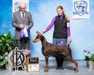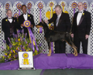 To be the breeder and owner of “Country”, Ch Walkaway Nothing Comes Close, and to be there when he won so many best-in-show awards, is an exhilarating experience, a dream come true. I appreciate the fine judges who awarded this mid-west Doberman so many wonderful wins and the breed and group people who supported him so strongly.